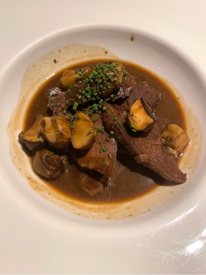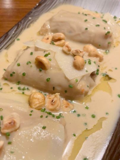 Recomano el caneló, el fals capuccino de crema de ceps amb escuma de formatge i xurros de bolets i els raviolis de foie amb fons de crema de carbassa i carrotes a l’oli de tòfona negra.