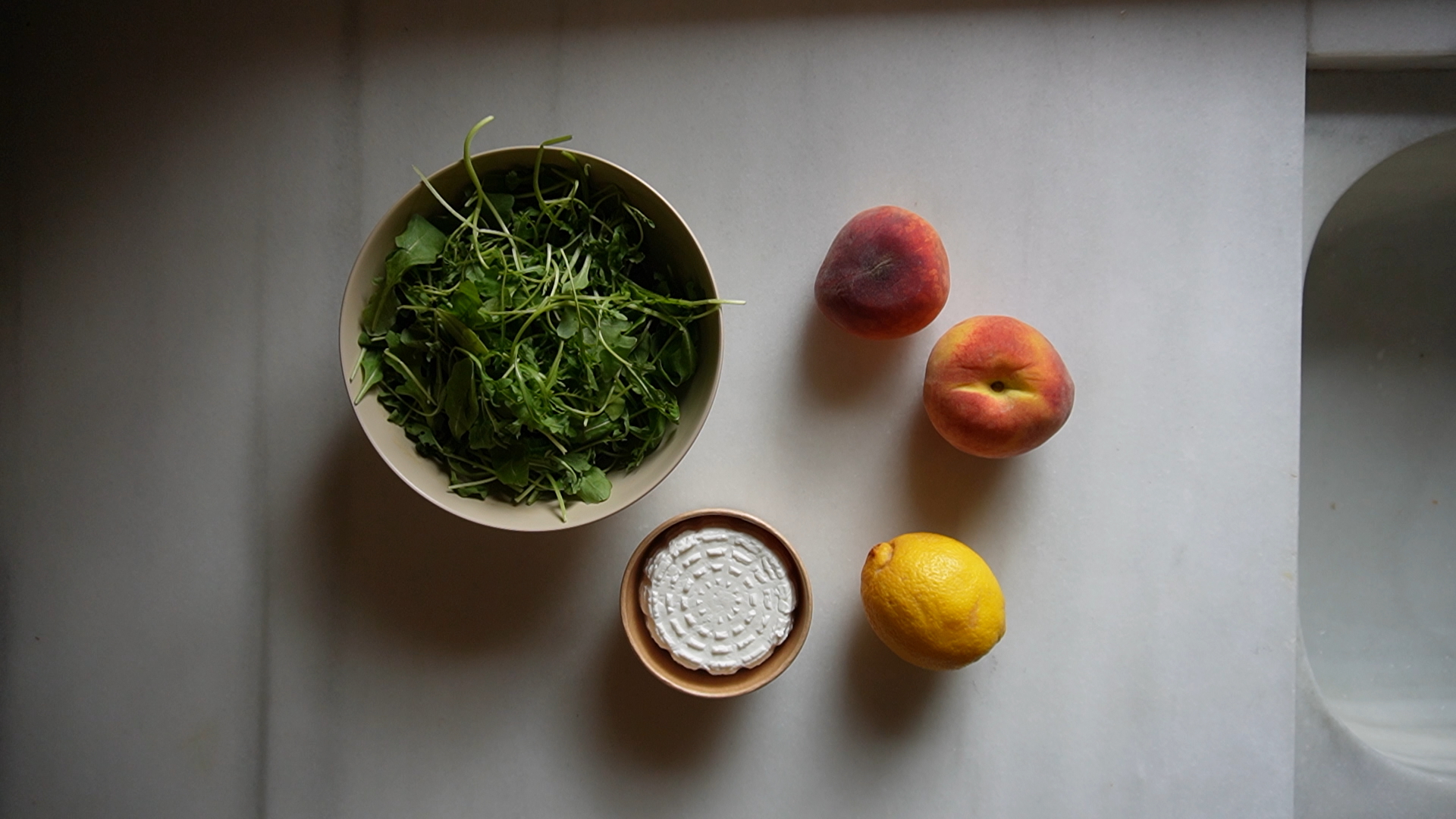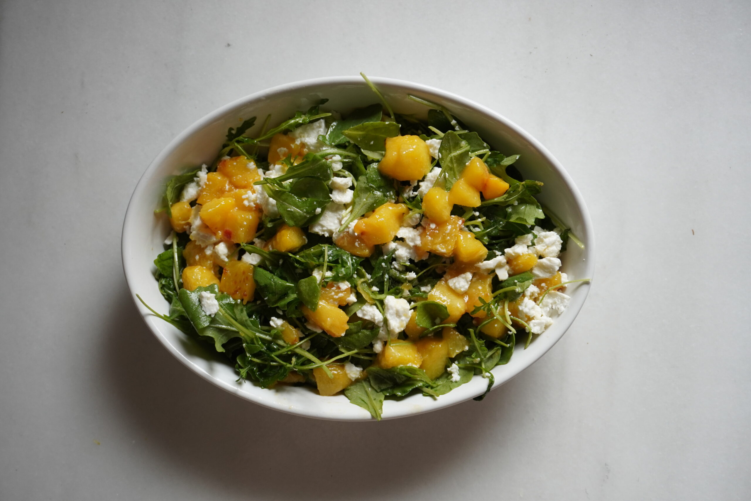 La clau d’aquesta amanida és aconseguir préssecs de proximitat, d’aquells que són sucosos i tenen gust a préssec de veritat. La ruca, si l’aconseguiu de la que no és de bossa, també notareu diferència.